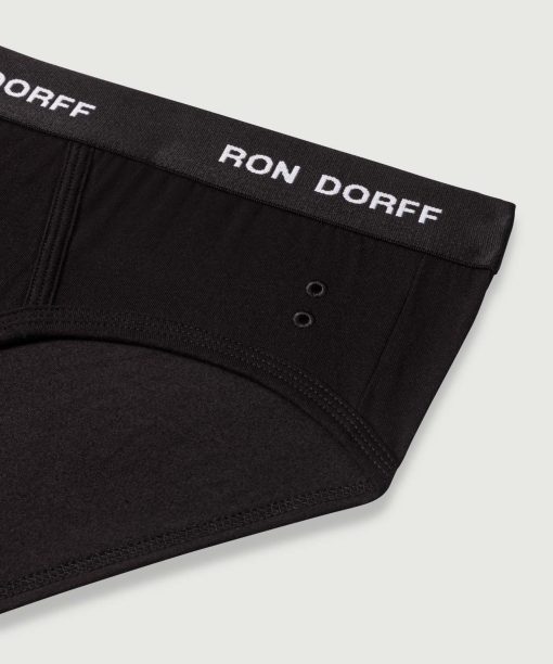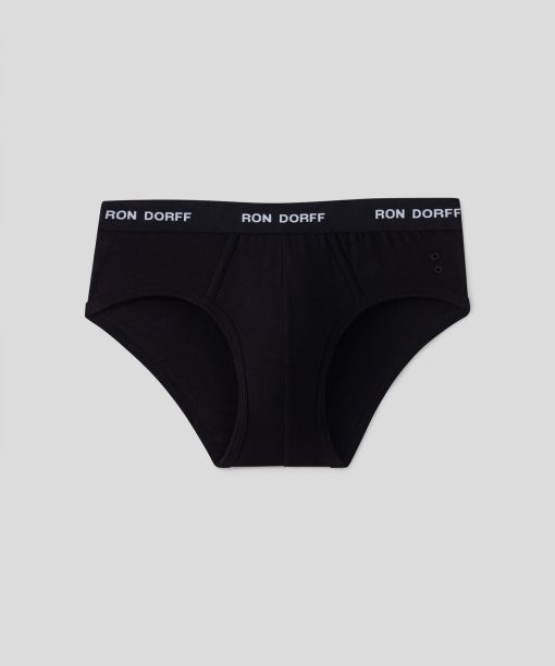 The new RON DORFF Y-front briefs with a visible, black, elastic waistband branded RON DORFF in white. Designed with a tapered fit and cut in the finest cotton jersey with a hint of elastane for a guaranteed fit wash after wash. Fly opening for maximum convenience. The two discrete, RD eyelets embroidered tone-on-tone on the side.