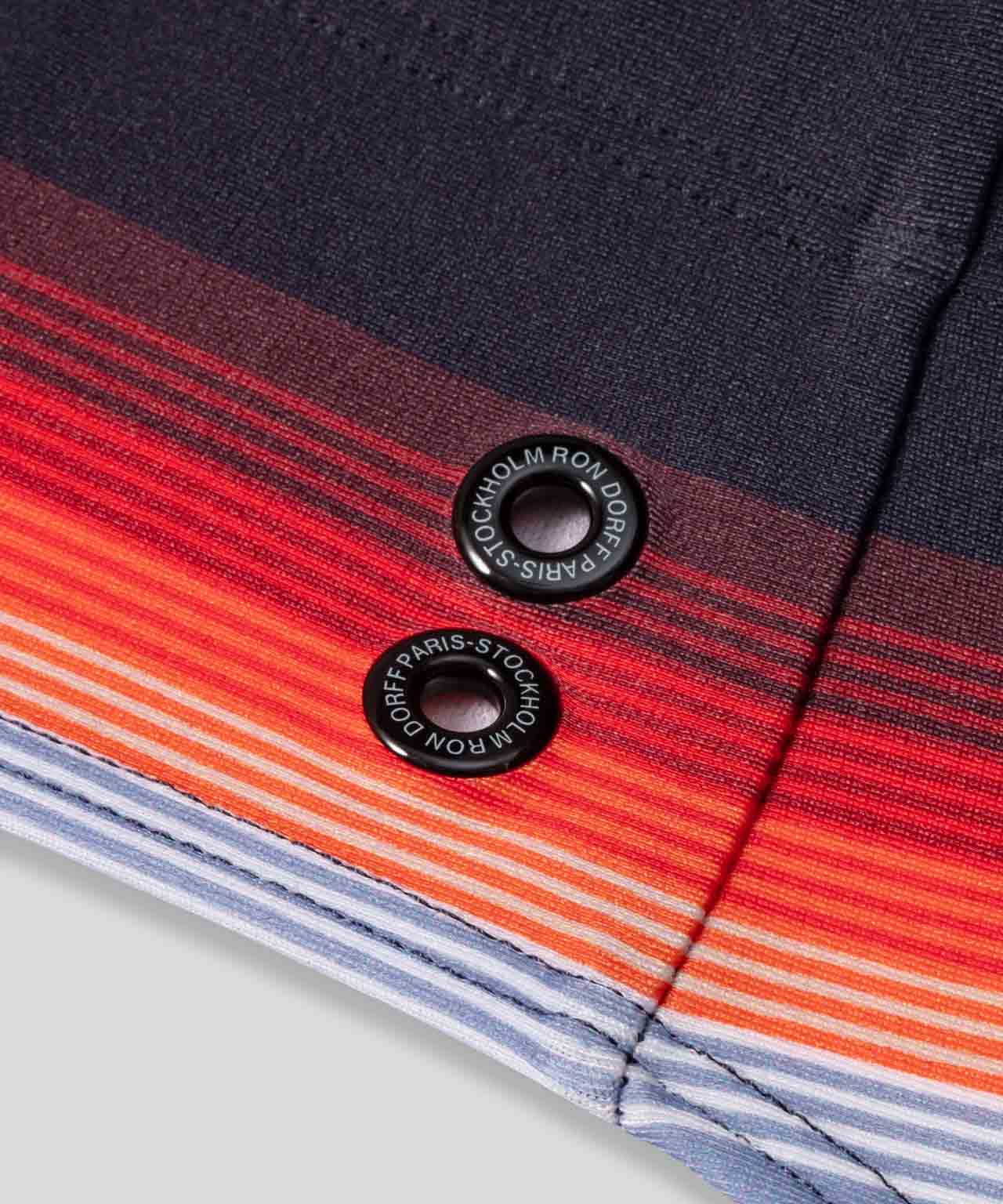 This model inspired by the cult Brazilian water polo briefs of the early 80s, the swim briefs is available with stripes at waist level. Made in an extra-thick but quick-drying Italian-made polyamide for optimized silhouette and guaranteed fit swim after swim. Breathable micro-mesh lining. Elastic waistband with interior drawstring. Ideal for frequent pool use. Featuring the double black-lacquered RD signature eyelets.