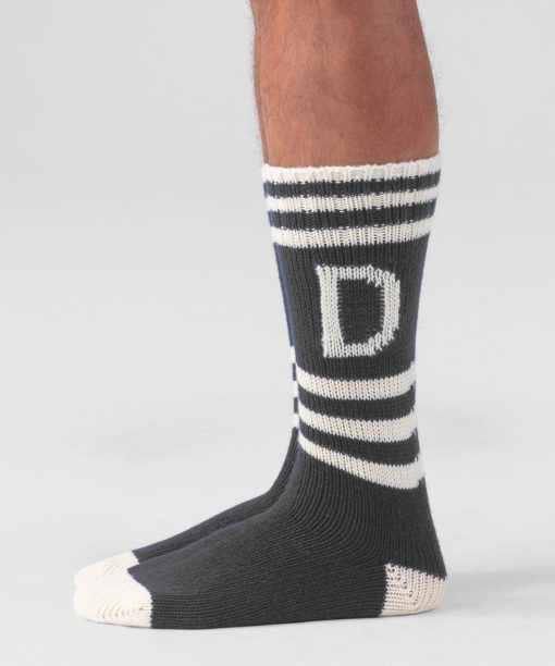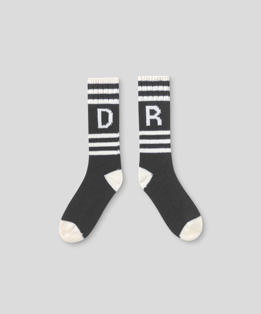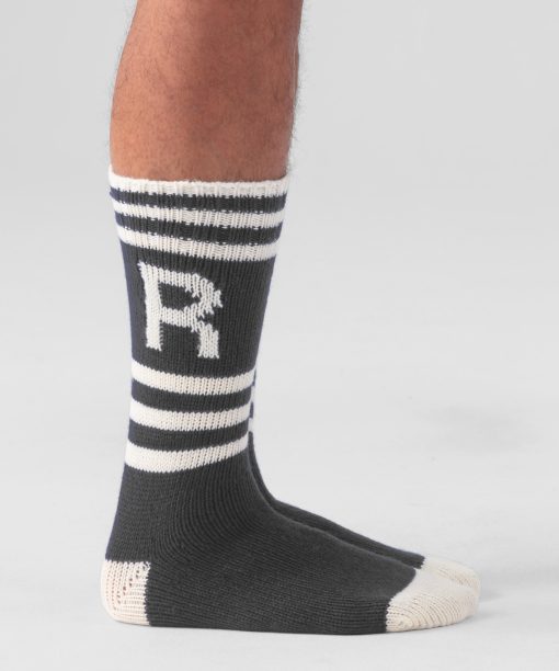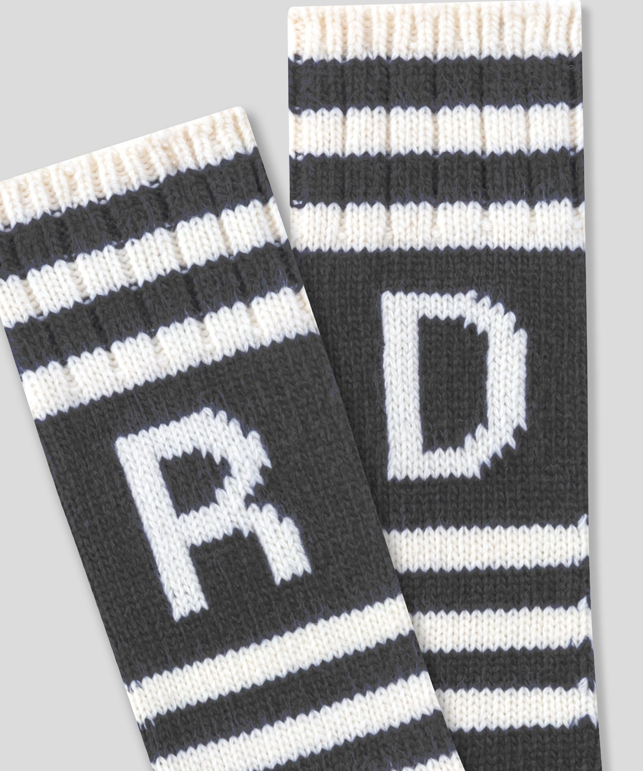 Traditional Nordic Ski socks knitted in a warm and comfortable mix of wool and polyamide. With an R on one sock and a D on the other with sport stripes. To be worn in the slopes, as well as in front of the fireplace with a pair of long johns and a cashmere hoodie.